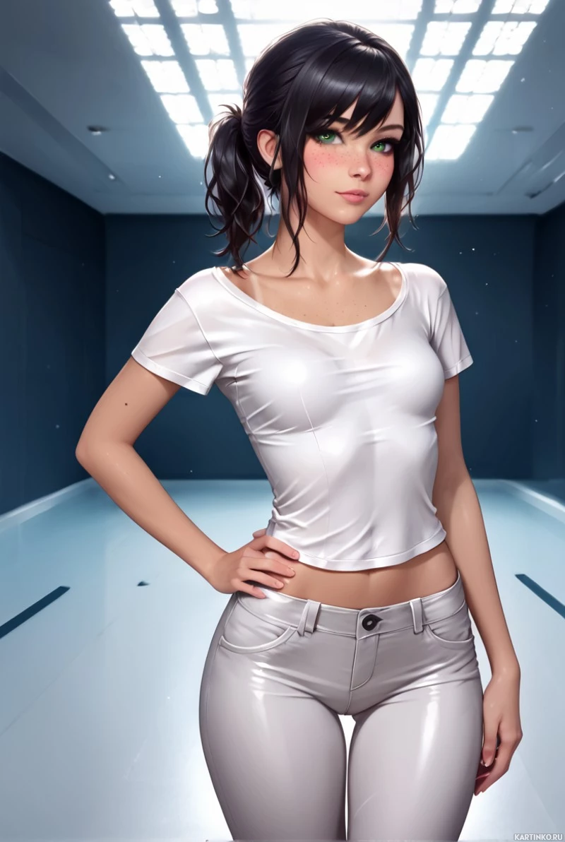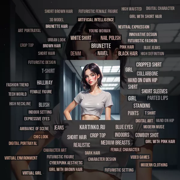 dark hair and wears a light grey crop top and high-waisted jeans that have a shiny, possibly metallic finish. The woman is looking directly at the viewer with