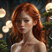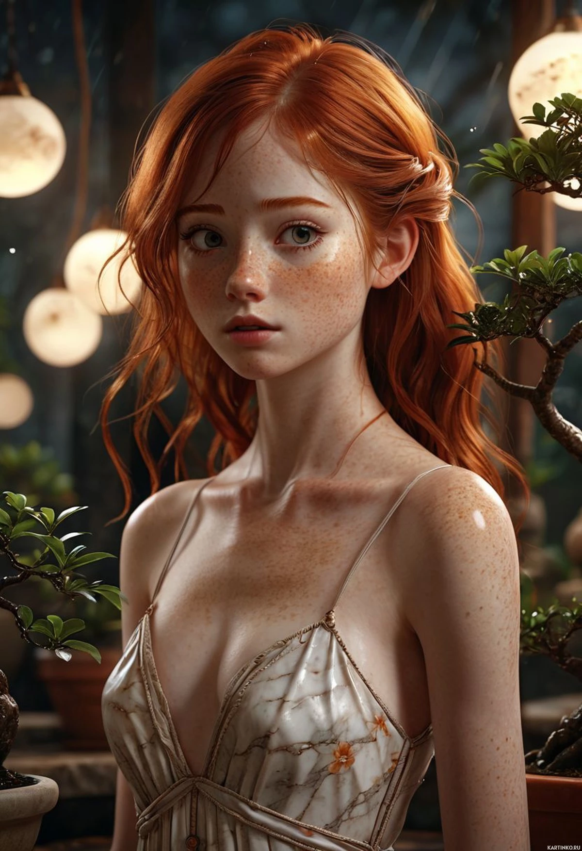 potted plant visible in the foreground. Her expression is neutral, and she seems to be looking directly at the viewer.