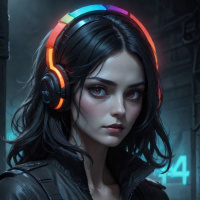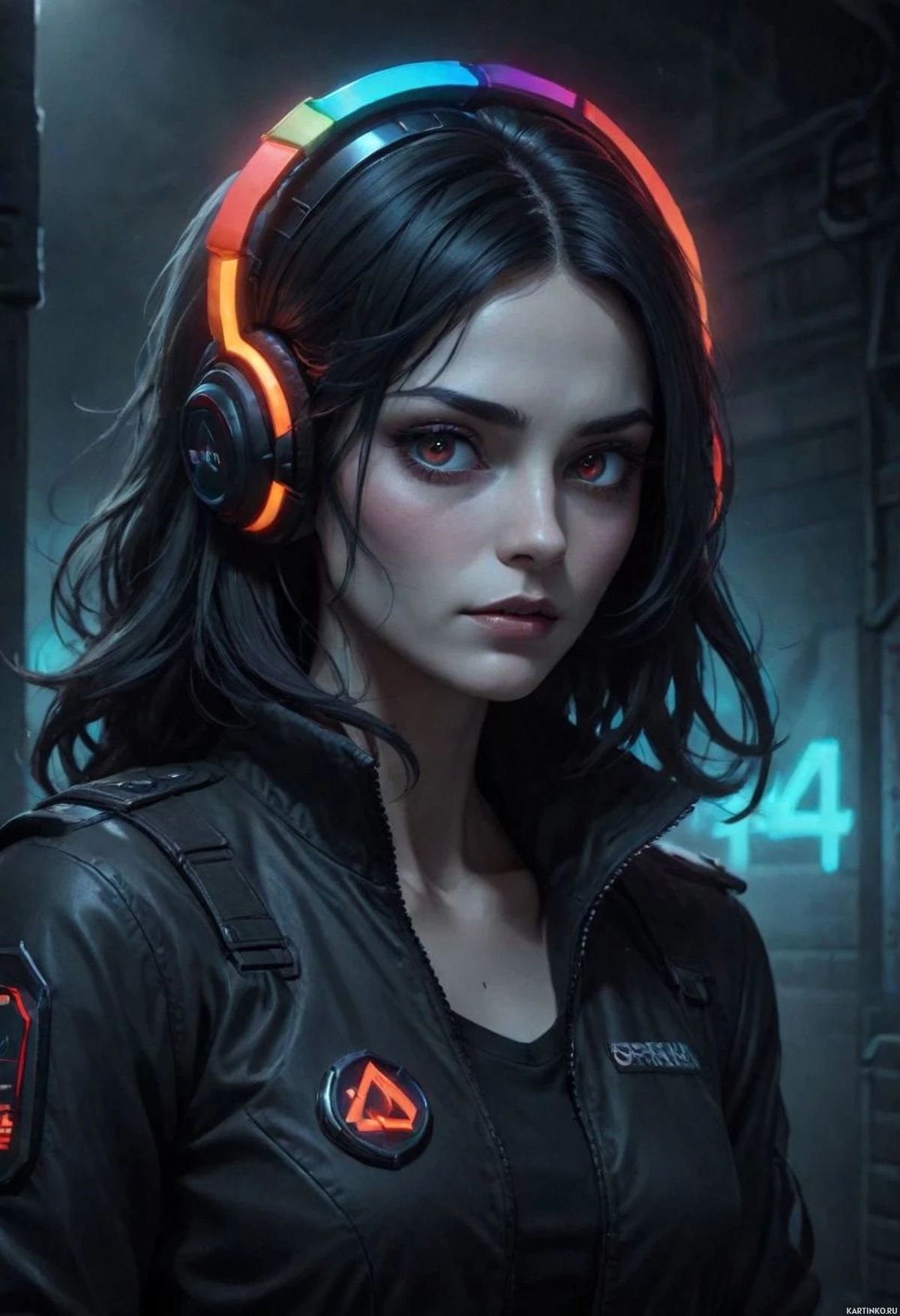 dark hair, is facing towards the viewer, and appears to be in an indoor setting that could possibly be a room with technological equipment. The style of the artwork suggests a modern, possibly futuristic theme, indicated by elements such as the headphones and
