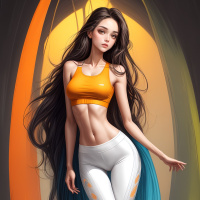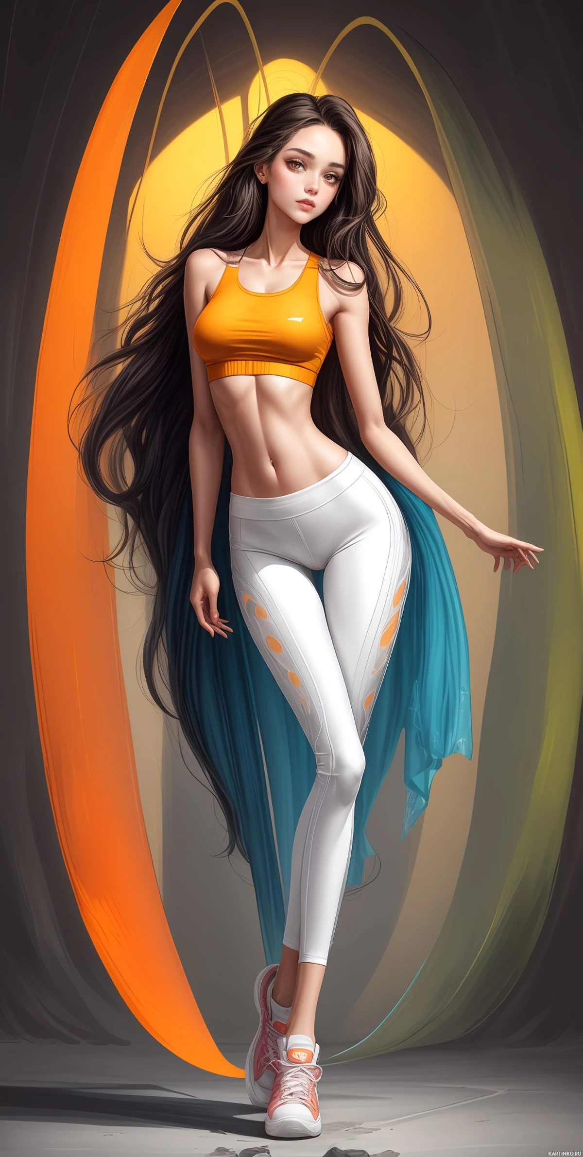 На картинке изображена женщина, стоящая в овальной рамке на фоне темного пространства с оранжевым геометрическим узором. На ней спортивная одежда, включая топ и леггинсы. У нее распущенные волосы, и она смотрит прямо в камеру.