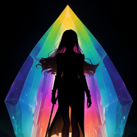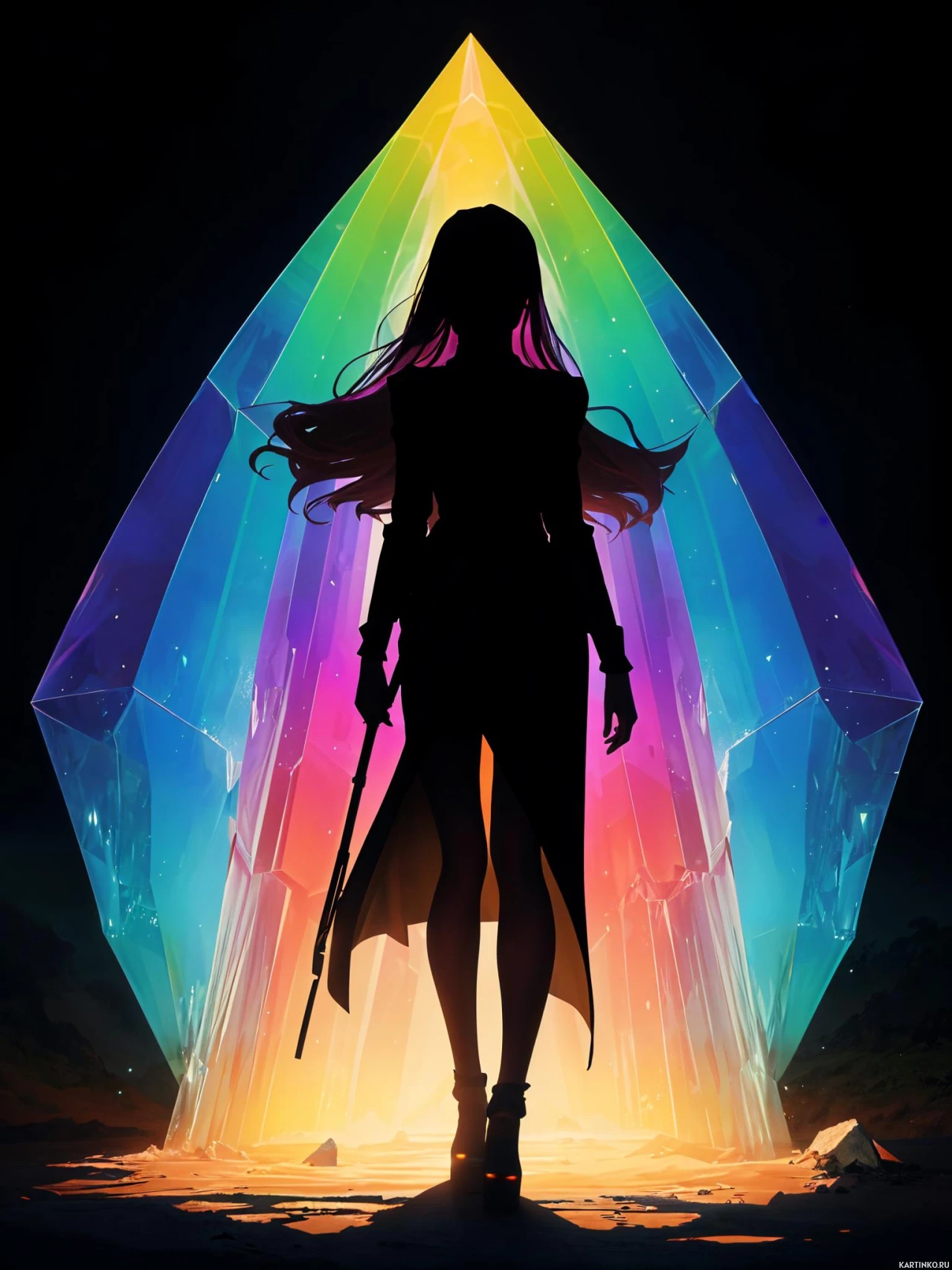 На картинке изображена женский силуэт на темном фоне. В правой руке она держит меч, а кажется, будто появляется из светящегося, похожего на кристалл или алмаз, объекта неправильной формы. Левая рука словно опирается на землю. Свет, исходящий от кристалла, создает вокруг нее драматическое сияние, намекая на то, что это персонаж из фэнтези или боевика.