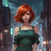 На картинке молодая женщина с рыжими волосами стоит на фоне городской среды, возможно, напоминающей типичную сцену из большого города. На ней зелёный топ и облегающие черные брюки. Задний план указывает на неоновую ночную атмосферу, характерную для многих мегаполисов.