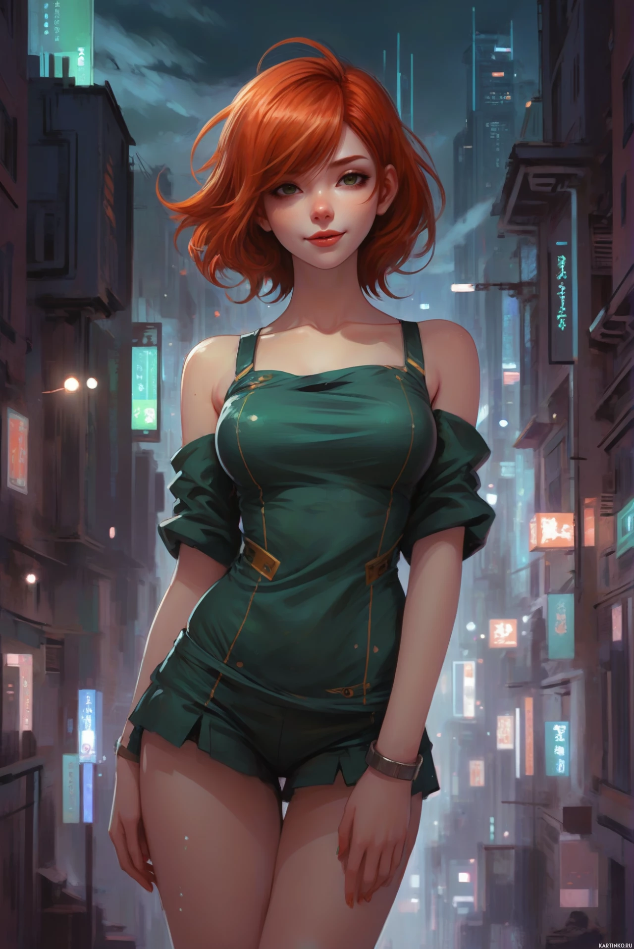 In the image, there is a young woman with red hair standing in what appears to be an urban setting, possibly reminiscent of a city scene. She is wearing a green top and tight-fitting black pants. The backdrop includes signs that suggest a neon nightlife ambiance typical of many metropolitan areas.