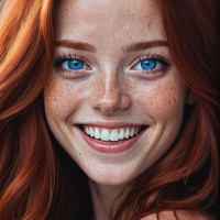 In this image, there is a young woman with red hair. She has a warm smile and sparkling blue eyes that are looking directly at the camera. The background appears to be a neutral gradient, providing a soft contrast that highlights her features.