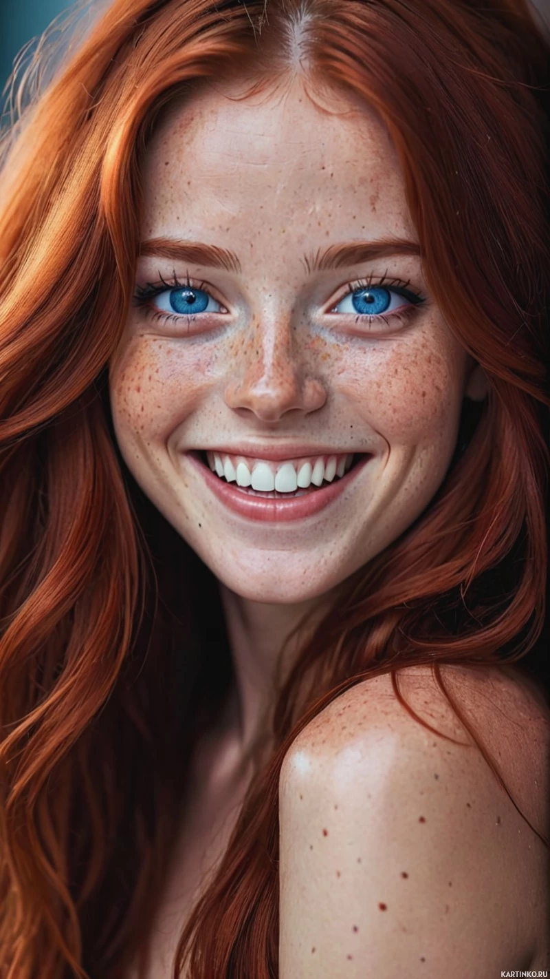 На этой картинке изображена молодая женщина с рыжими волосами. У неё тёплая улыбка и сверкающие голубые глаза, смотрящие прямо в камеру. Фон представляет собой нейтральный градиент, создающий мягкий контраст, который подчеркивает её черты.