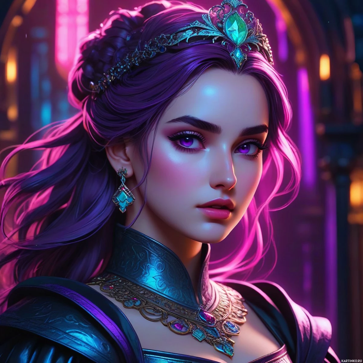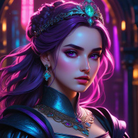 The image shows a character with purple hair styled in an elaborate braid and crown, set against the backdrop of what appears to be a stained glass window. The character is wearing a dark-colored outfit that seems armored, suggesting a fantasy or medieval setting. There are intricate designs and jewelry visible on the character's attire, which contributes to the overall regal appearance. The lighting in the image casts a soft glow around the figure, highlighting their features and the ornate details of the costume.