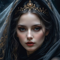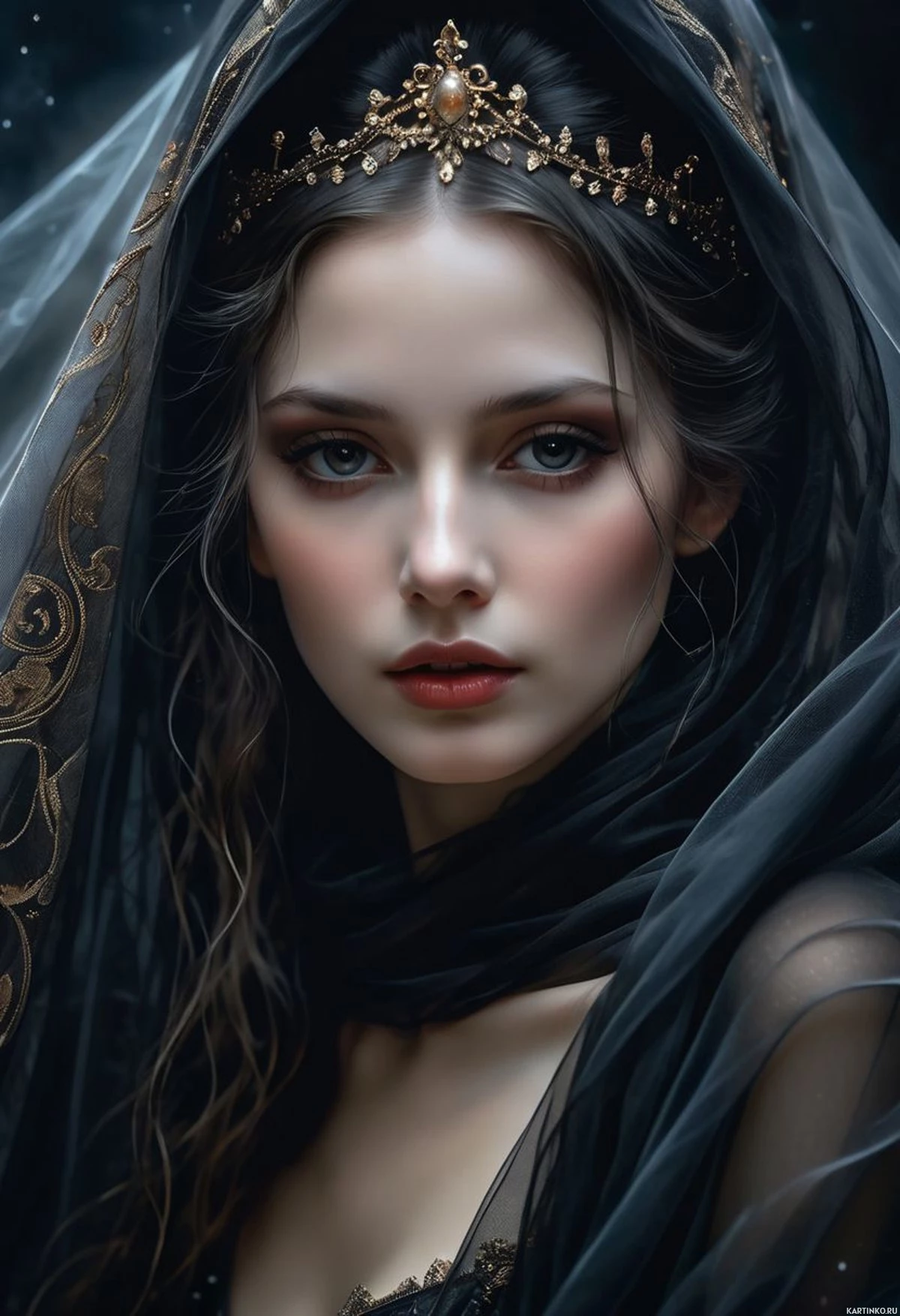 dark hair and is adorned with a headpiece that appears to be part of her outfit, possibly indicating a historical or fantasy theme. Her expression is soft and contemplative as she looks slightly off-camera. Her lips are lightly tinted with