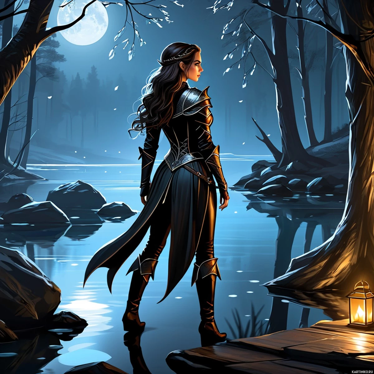 body of water, possibly a lake, which reflects the moonlight from above. Her back is turned to the viewer, suggesting she may be gazing off into the distance. The girl has