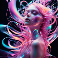 vibrant colors, possibly suggesting a fantastical or dream-like atmosphere. The background is dark with hints of otherworldly elements such as sparks or particles floating around, adding to