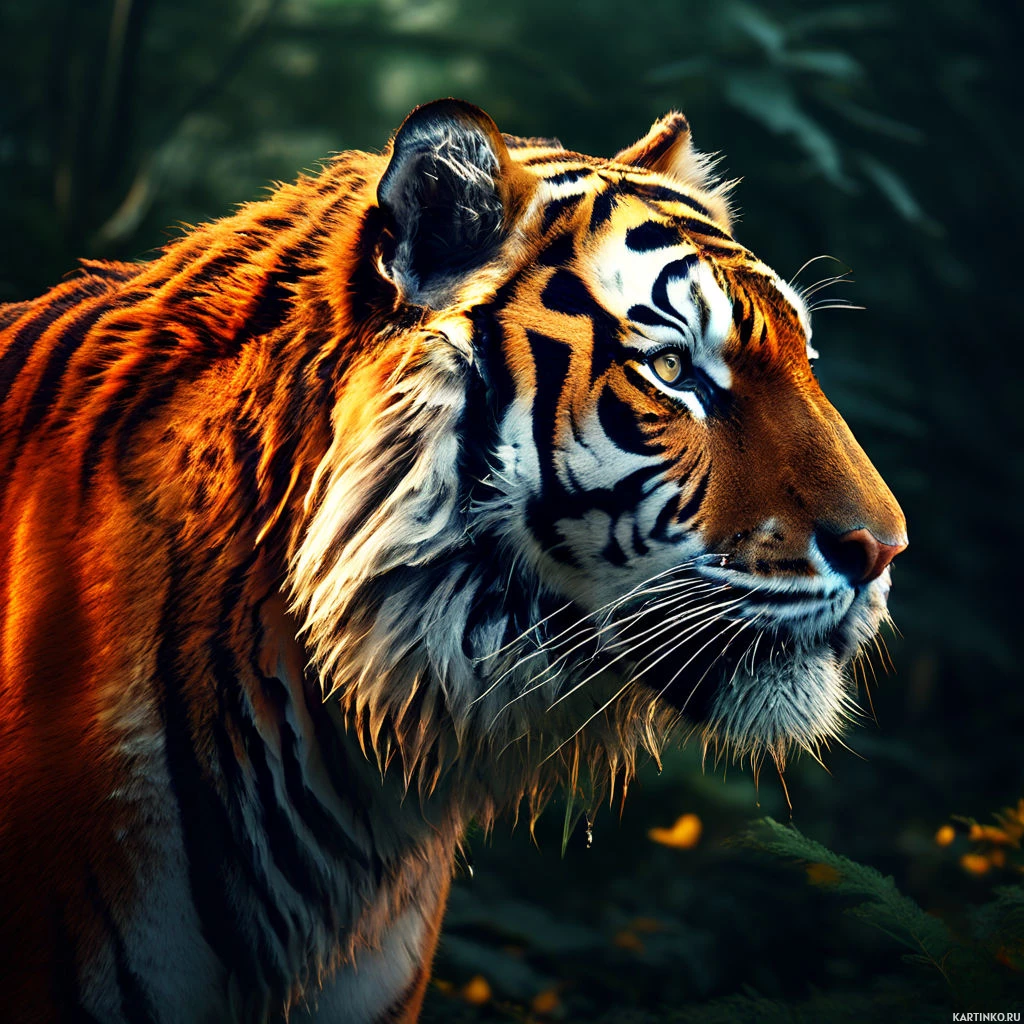 a majestic presence with its striking orange and black fur patterns, distinctive stripes, and strong, muscular build. Its eyes are open wide, giving it