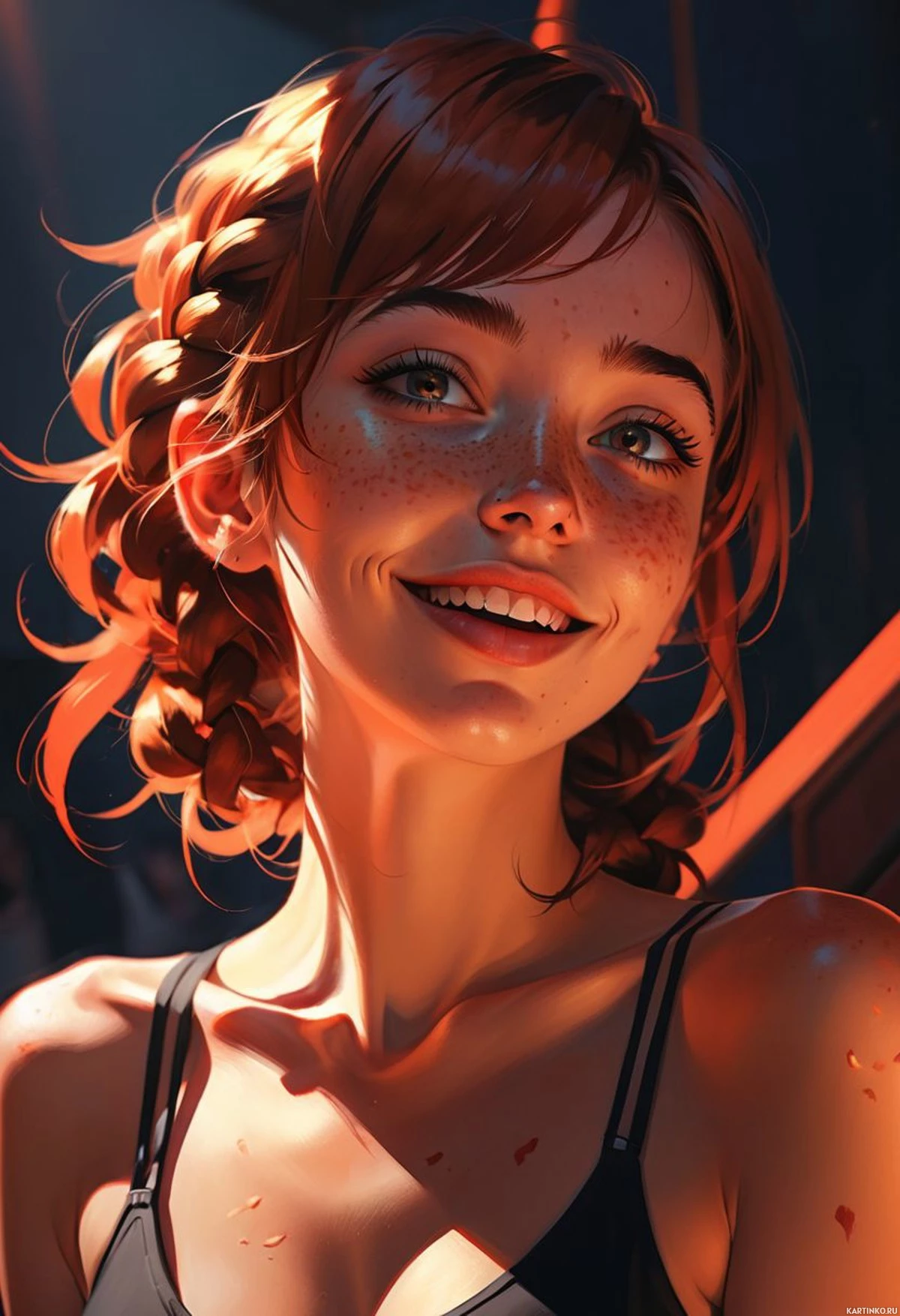 a black top and has an expressive smile on her face. The character's skin tone is a light shade, and she seems to have prominent cheekbones, which could suggest she has