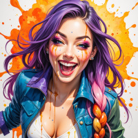 purple hair and multiple colorful splashes of paint around their face. This individual is wearing
