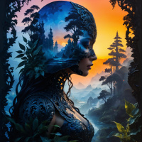 a mountain range with trees and foliage surrounding the character, suggesting a scene from a fantasy or mythical world. The color palette is vibrant, with
