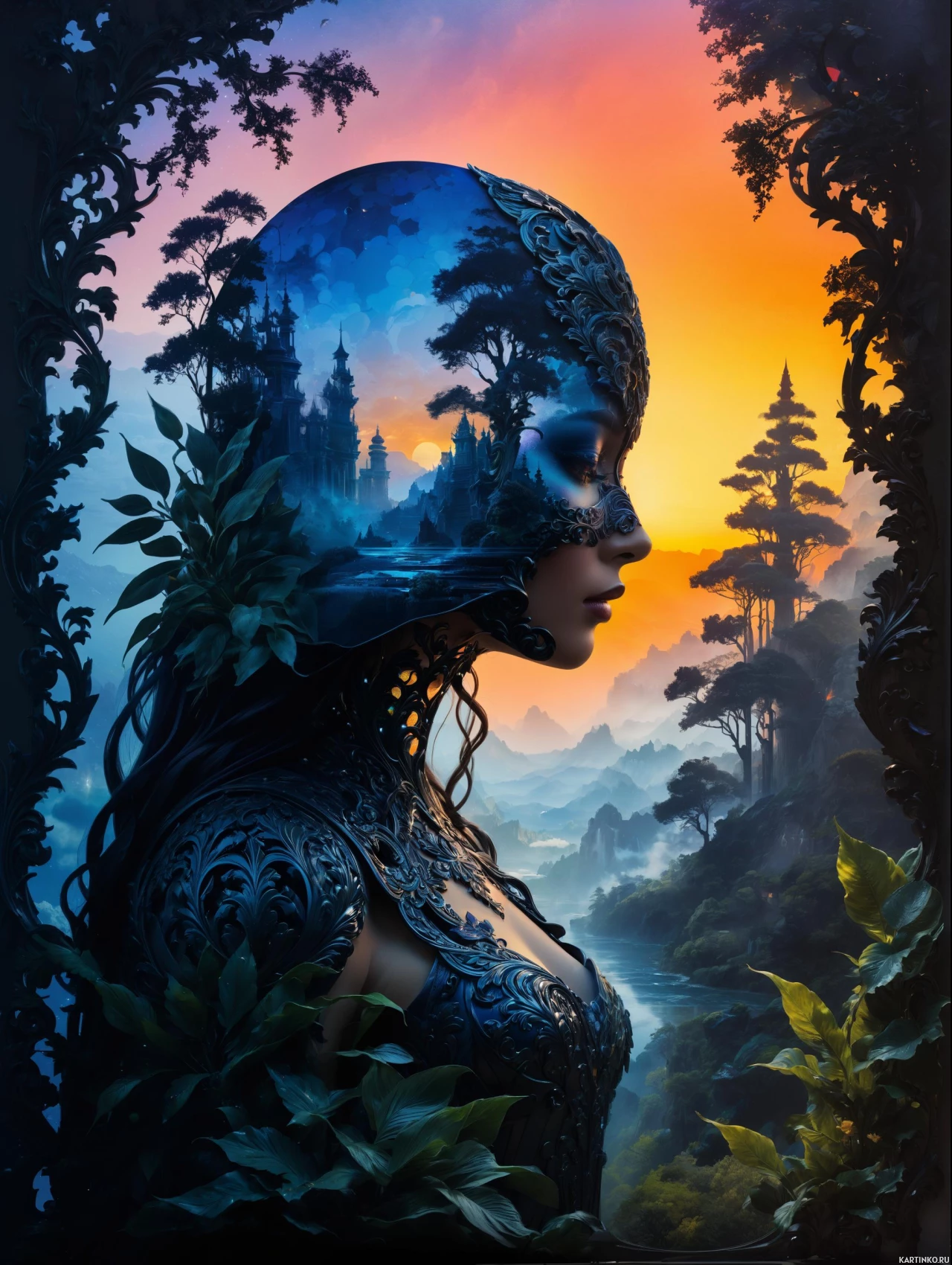 intricate patterns and designs that are inspired by nature. Her face is obscured by the mask, giving her