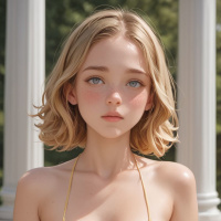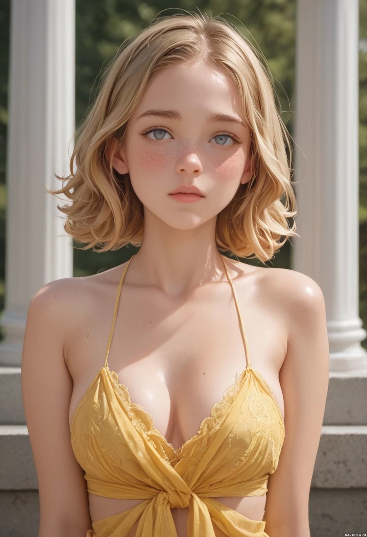 short hair and is wearing a yellow bikini top with a tied detail around the neckline. Her pose is straight, and she looks directly at the camera with her lips slightly parted as if posing for the photo. The lighting suggests it might be daytime, with natural light casting