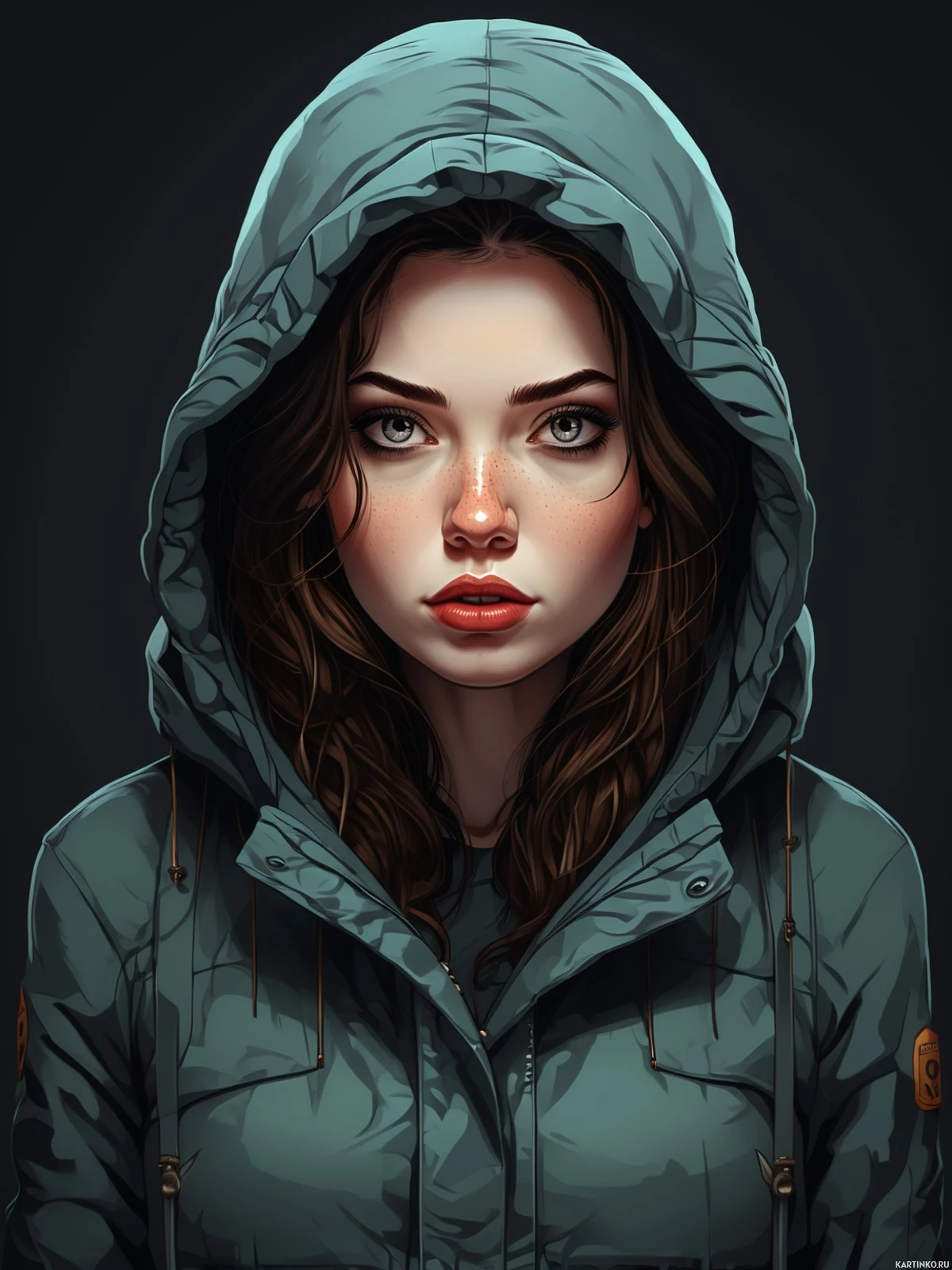 a young woman with striking features, such as prominent cheekbones and large eyes. She has