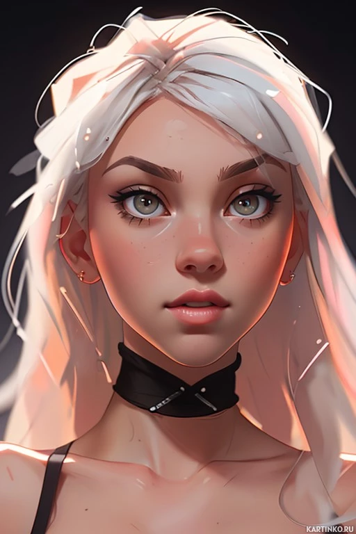 На картинке — трехмерная визуализация девушки с белыми волосами. У неё голубые глаза, нежно-розовые губы и светлая кожа. Выражение лица нейтральное. На шее у неё чёрный чокер. Картинка чёткая и хорошо освещённая.