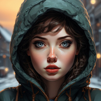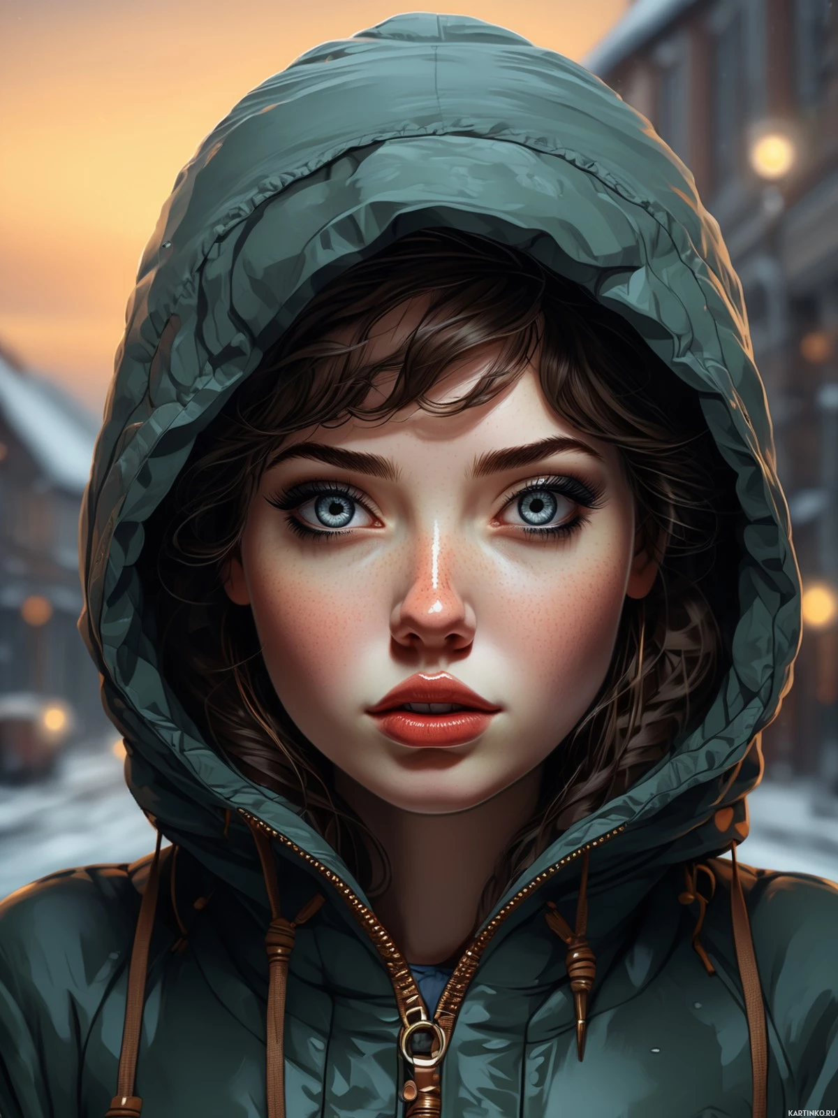 pinkish blush on her cheeks, which gives her a youthful appearance. The girl is wearing a green hooded jacket with