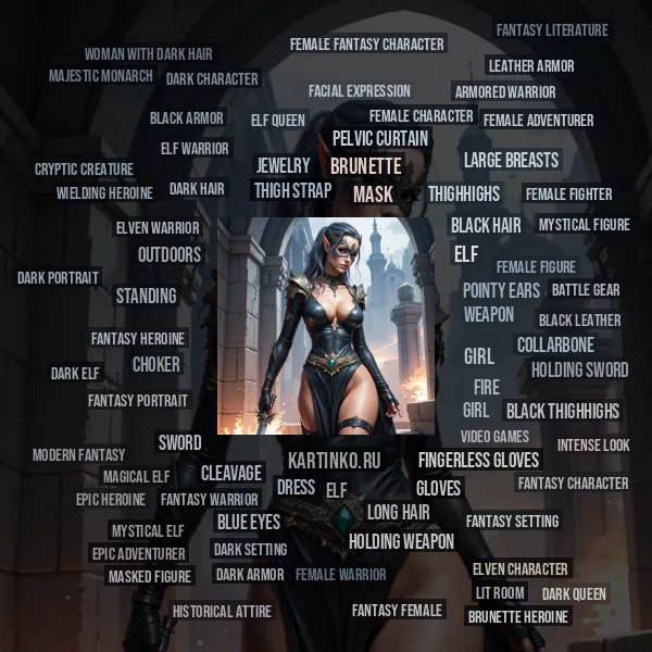 dark hair and pointed ears that suggest an elf-like appearance. Her