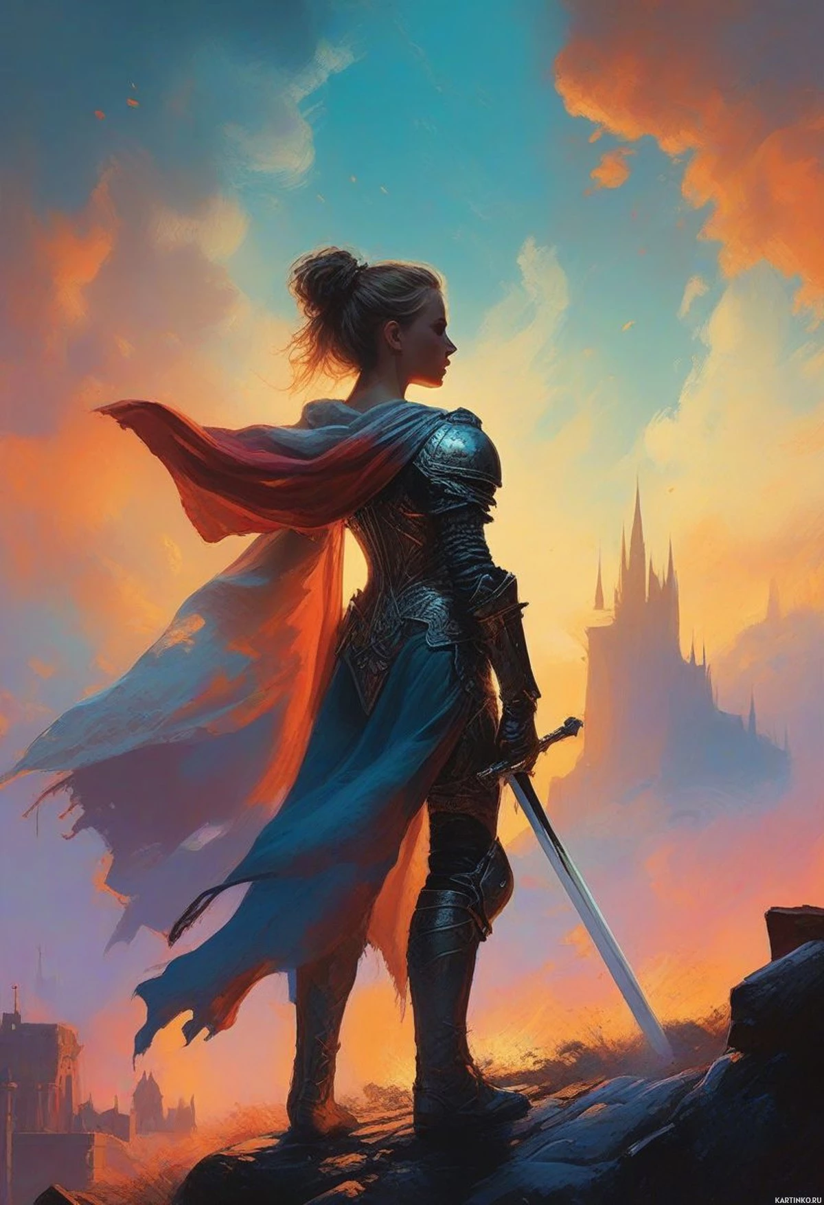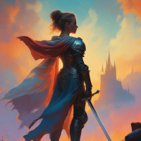 suit of armor and holds a sword in her right hand, suggesting she may be a knight or warrior. Her attire includes a blue cloak with