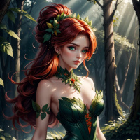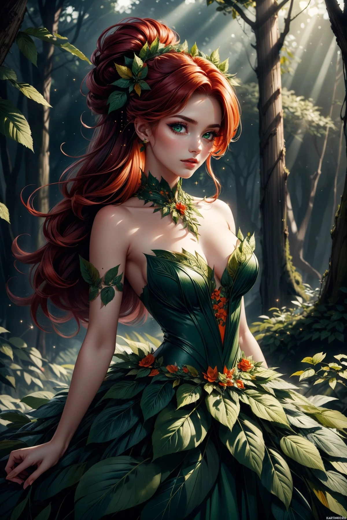 a female character with red hair wearing a green dress. She is situated in what appears to be