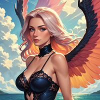 a serene seascape, with the ocean visible beneath her feet. The sky above has soft clouds, suggesting a calm or