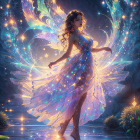 The image depicts a female figure who appears to be an angel or a spirit, characterized by her large wings that resemble stylized birds. She has long hair and is adorned with what looks like star-like patterns on her outfit and wings. Her pose suggests she may be in motion, possibly dancing or floating. The background features a cosmic scene with stars and what appears to be a nebula, giving the impression of an otherworldly environment. The overall tone of the image is mystical and ethereal.