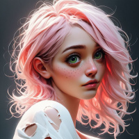 pink hair. She has a stylized appearance, with exaggerated features such as