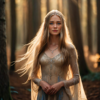 In the image, there is a girl who appears to be blonde with her hair styled in loose waves that cascade down her shoulders. She is wearing a dress that seems to have a medieval or fantasy design with long sleeves and a high neckline, suggesting an era of historical fashion. The dress has a light-colored base, possibly cream or off-white, adorned with intricate embroidery or detailing on the bodice. She stands in a serene forest setting, where sunlight filters through the canopy of tall trees, creating a dappled light that casts patterns on her dress and surroundings. The overall ambiance is one of tranquility and timeless elegance.