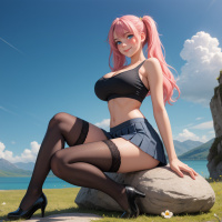 black stockings with visible lace trim at the toes. In the background, there is a serene landscape with clear skies, mountains, and greenery, suggesting a peaceful,