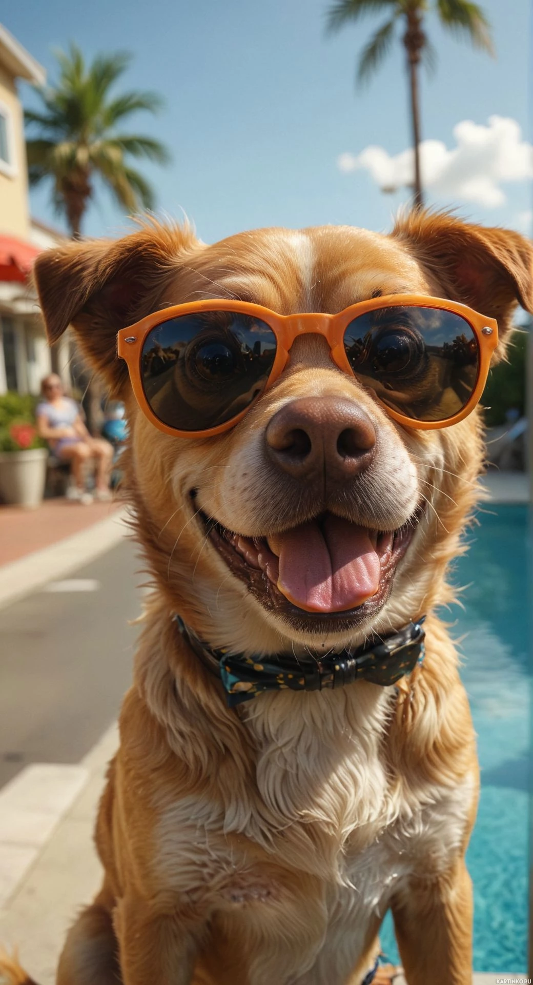 orange sunglasses and has its tongue playfully sticking out. It appears to be in a relaxed and happy pose. The setting suggests it might be