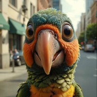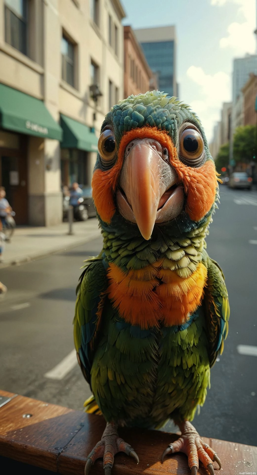 colorful plumage with hues of green, blue, and yellow. It appears to be looking off to the side with an expression that suggests curiosity or interest. The background of the photo shows a city