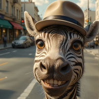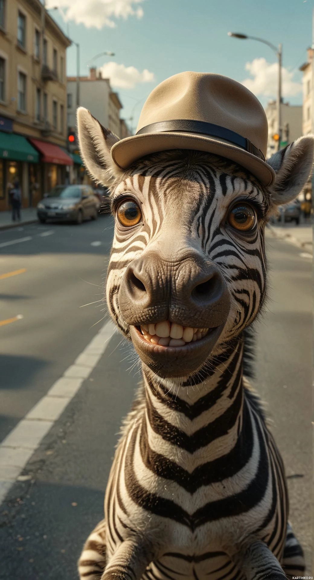a fedora hat. The zebra is standing on a street, with a sidewalk to its left and