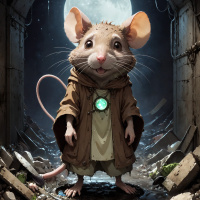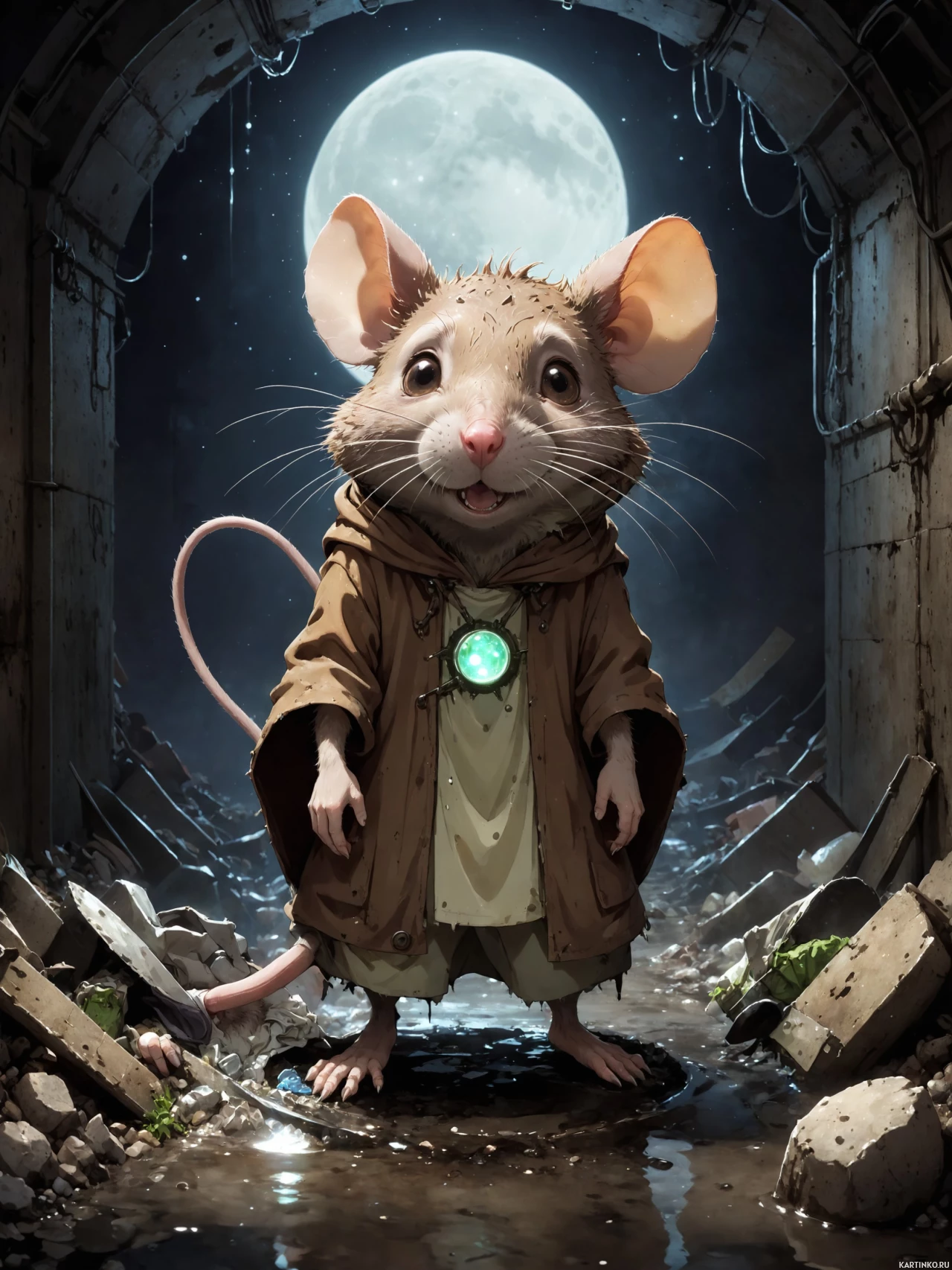 The image features a mouse character dressed in what appears to be a robe, standing in