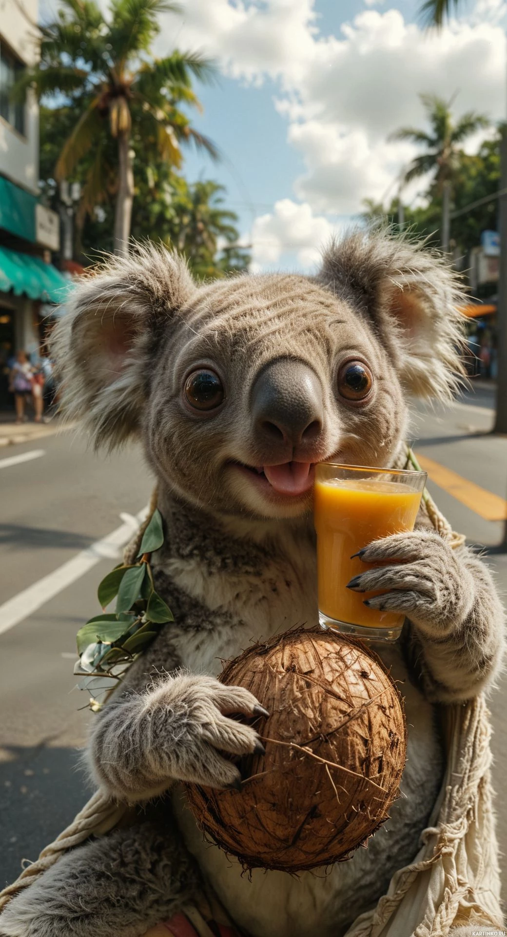 an orange juice in one hand and a coconut shell in the other. It's wearing what appears to be a grass skirt or