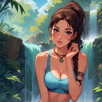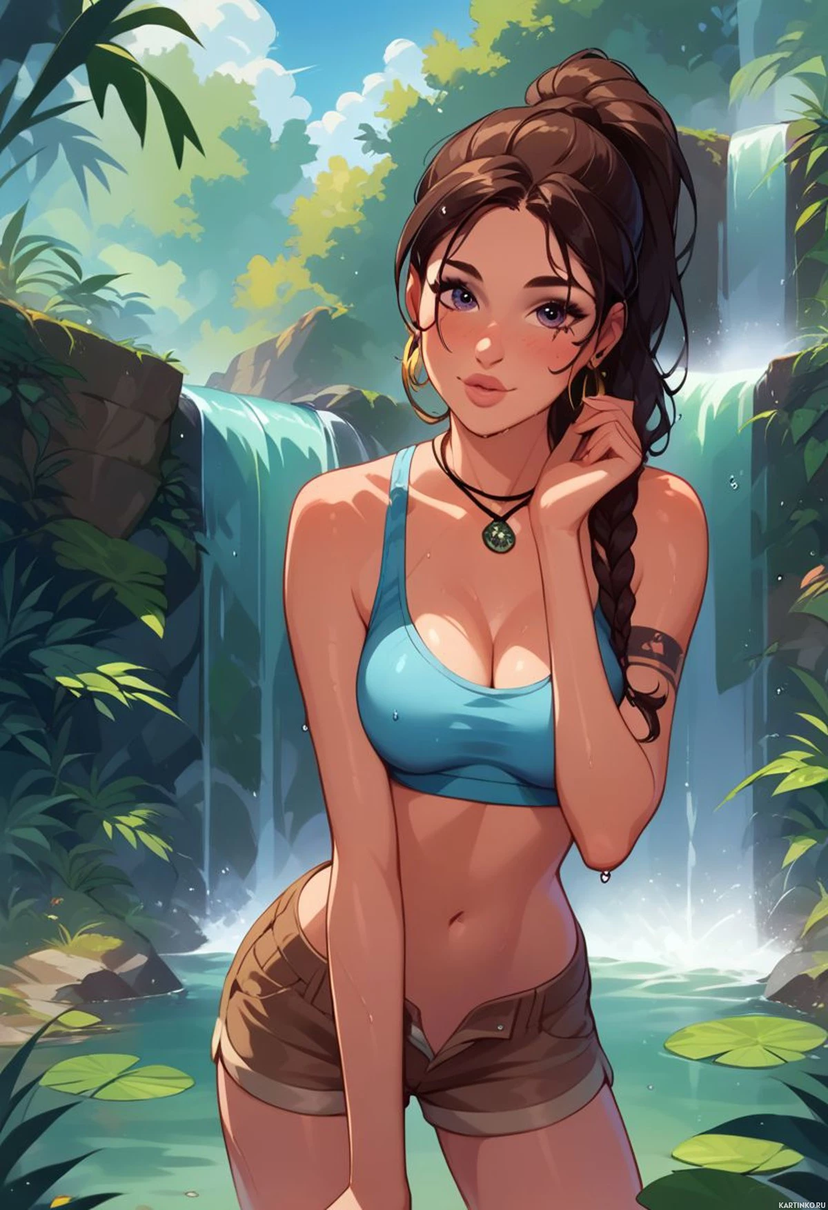 In the image, a young woman with long hair is posing in front of a waterfall. She is wearing a bikini top and jean shorts. The background features lush greenery, suggesting a tropical or jungle setting.