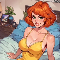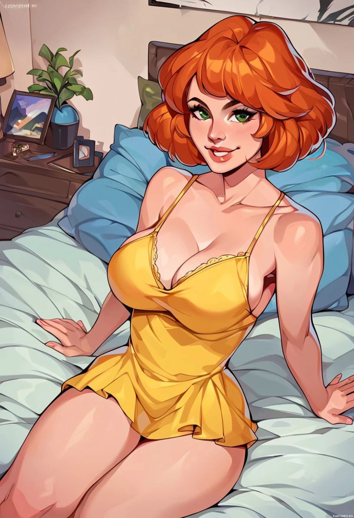 a cheerful expression on her face and is sitting comfortably on a bed. She is wearing a yellow one-piece swimsuit that accentuates her figure, revealing a portion of her cleavage. To the side, there's