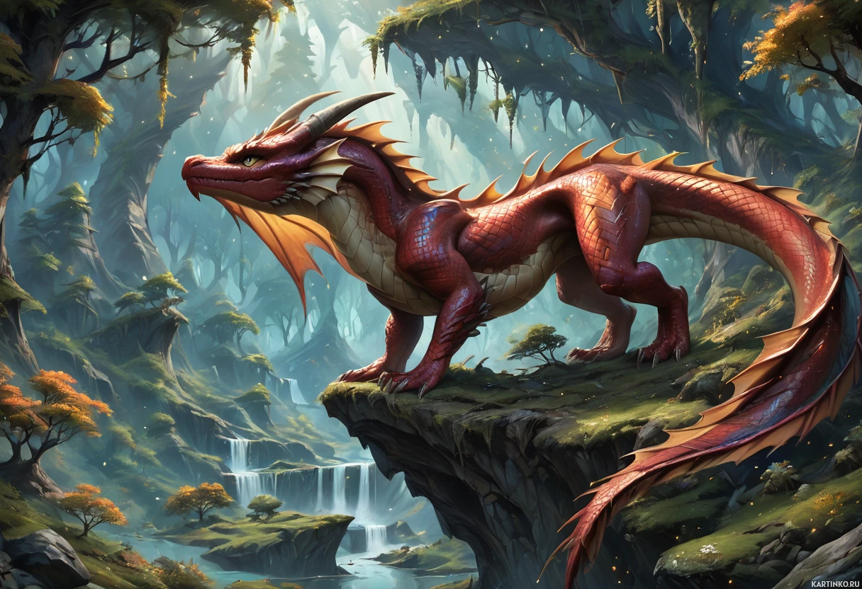 a fantasy scene. The central figure in the image is a dragon, characterized by its red scales with
