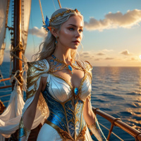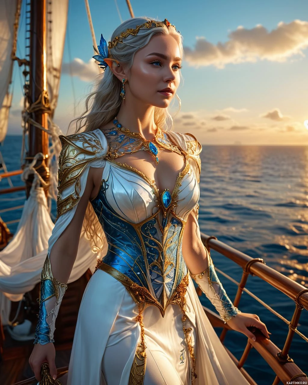 white hair, wearing an intricate costume that includes armor and a dress. She has a necklace around her neck and is adorned with jewelry. The character appears to be standing on the deck of a ship at sunset or sunrise, given