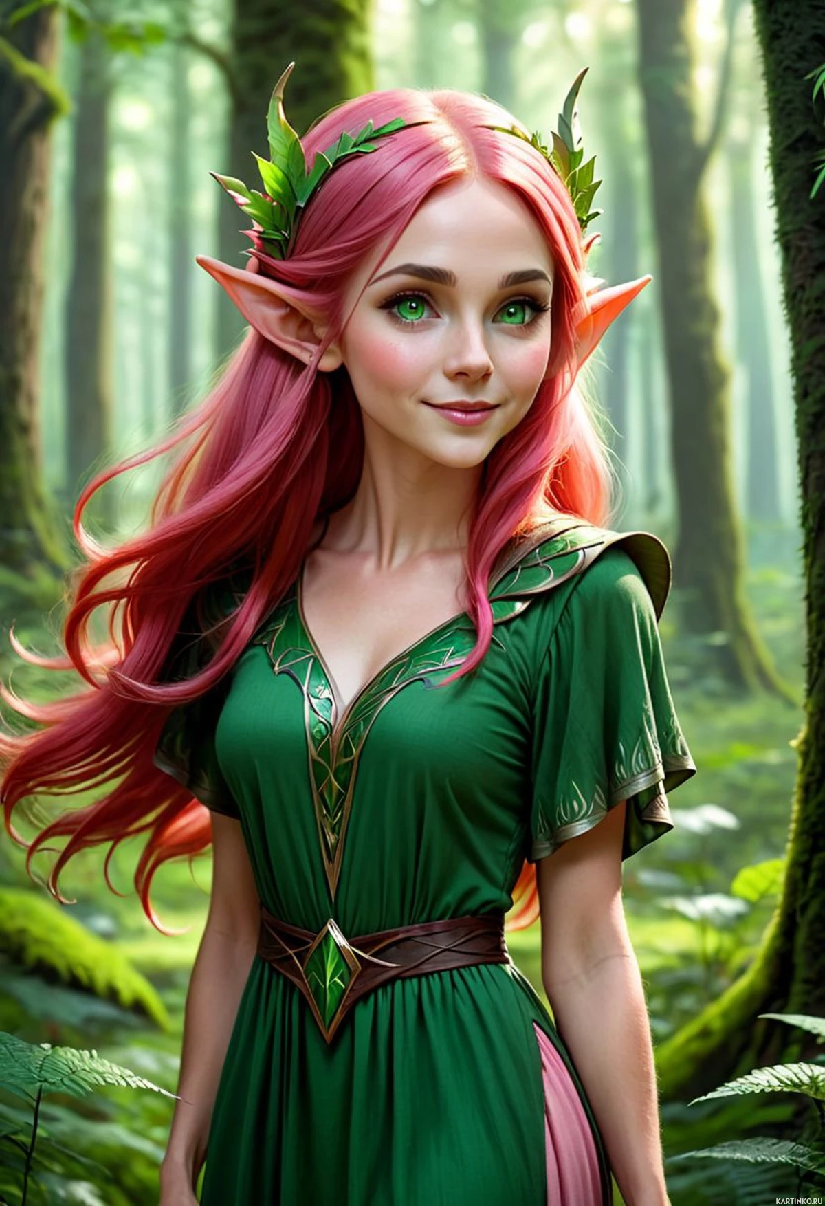 На картинке изображена девушка с розовыми волосами в сказочном наряде: зеленое платье и пояс. Она стоит на лесной тропинке, по обе стороны от которой возвышаются огромные деревья. Мягкий свет указывает на рассвет или закат.