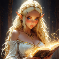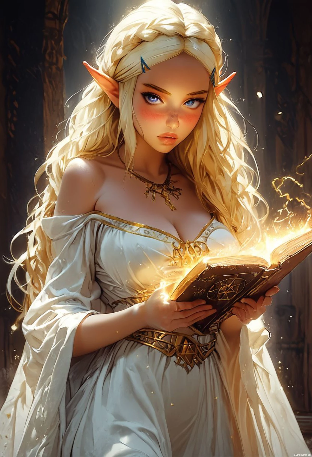 blonde hair and fair skin, which are common characteristics for fantasy elves in popular culture. The character is wearing what looks like traditional elven attire with