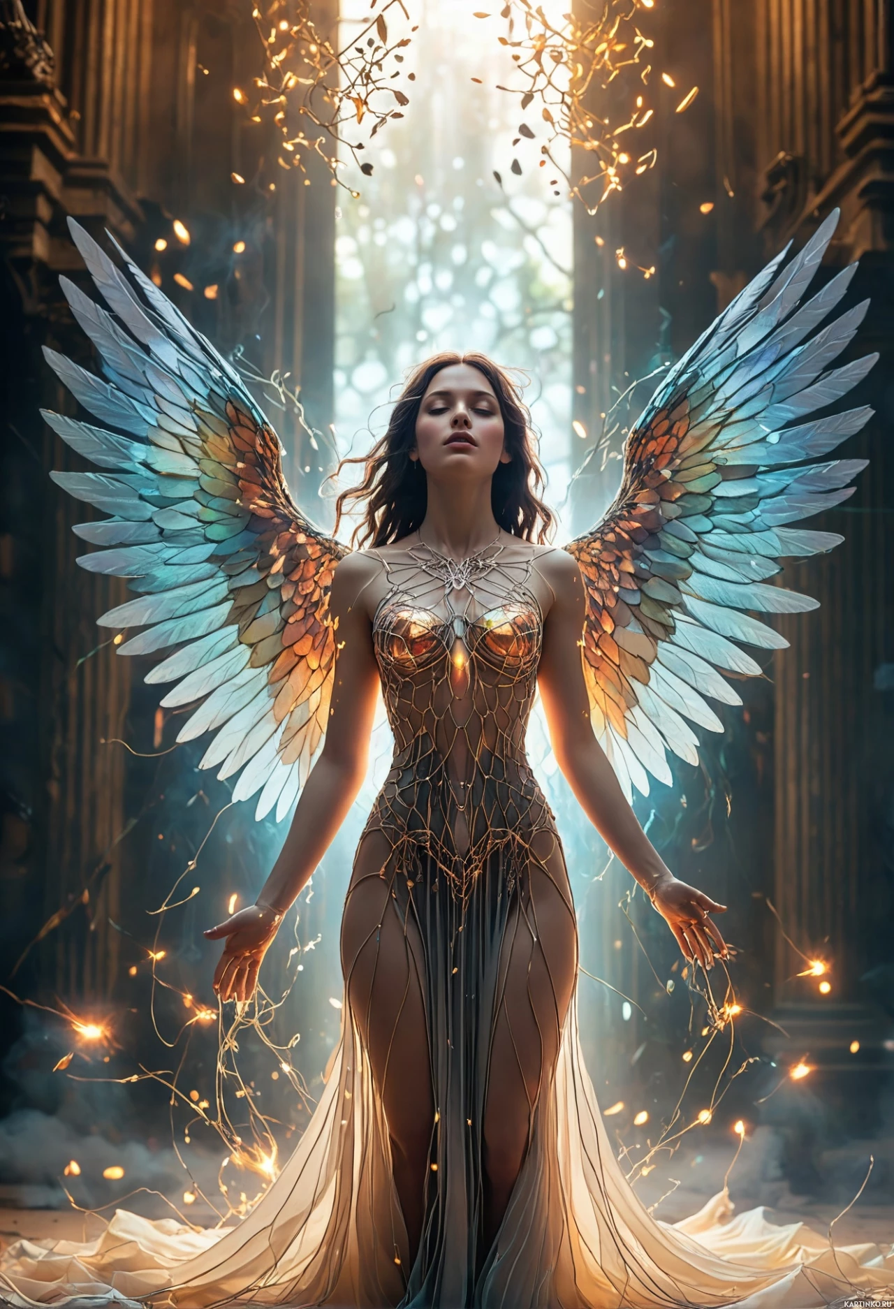 brown hair and is adorned with ornate attire that includes feather-like wings on her back, suggesting an otherworldly or mythical nature to her presence. The setting appears to be inside