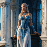 blonde hair and is dressed in elaborate costume that includes blue armor with gold accents and wings attached to her back. The setting appears to be a classical architecture style structure, reminiscent of a palace or castle. It's a stylized artistic representation rather than a real-