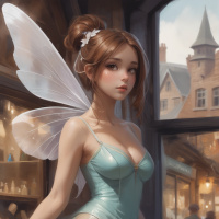 fantasy character dressed in an alluring costume reminiscent of traditional fairy attire. She has wings, a horn on her head, and a tail that suggest she is a depiction of an angel or a fairy. Her expression is one of seduction with puckered lips, and her body language conveys
