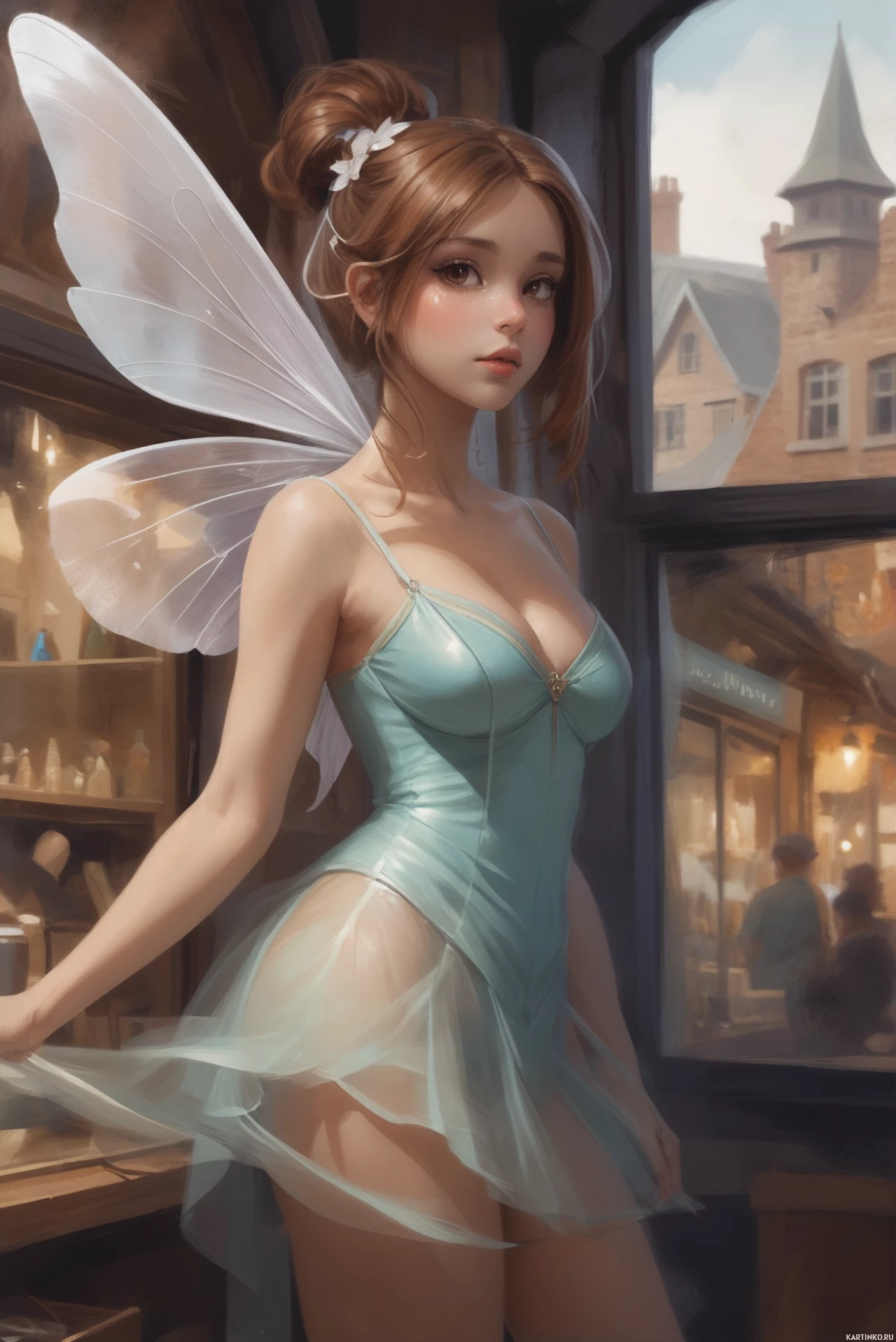 a room with windows looking out to a cityscape, which adds depth to the fantastical theme of the artwork.
