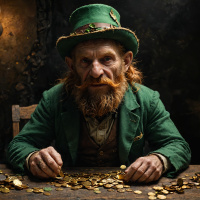 mythical creature with a beard and mustache, wearing traditional Irish attire including a green hat with a buckle on the front. The creature is seated at a table where several coins are scattered across its surface, suggesting an act of alchemy or coin-making that is often attributed to such