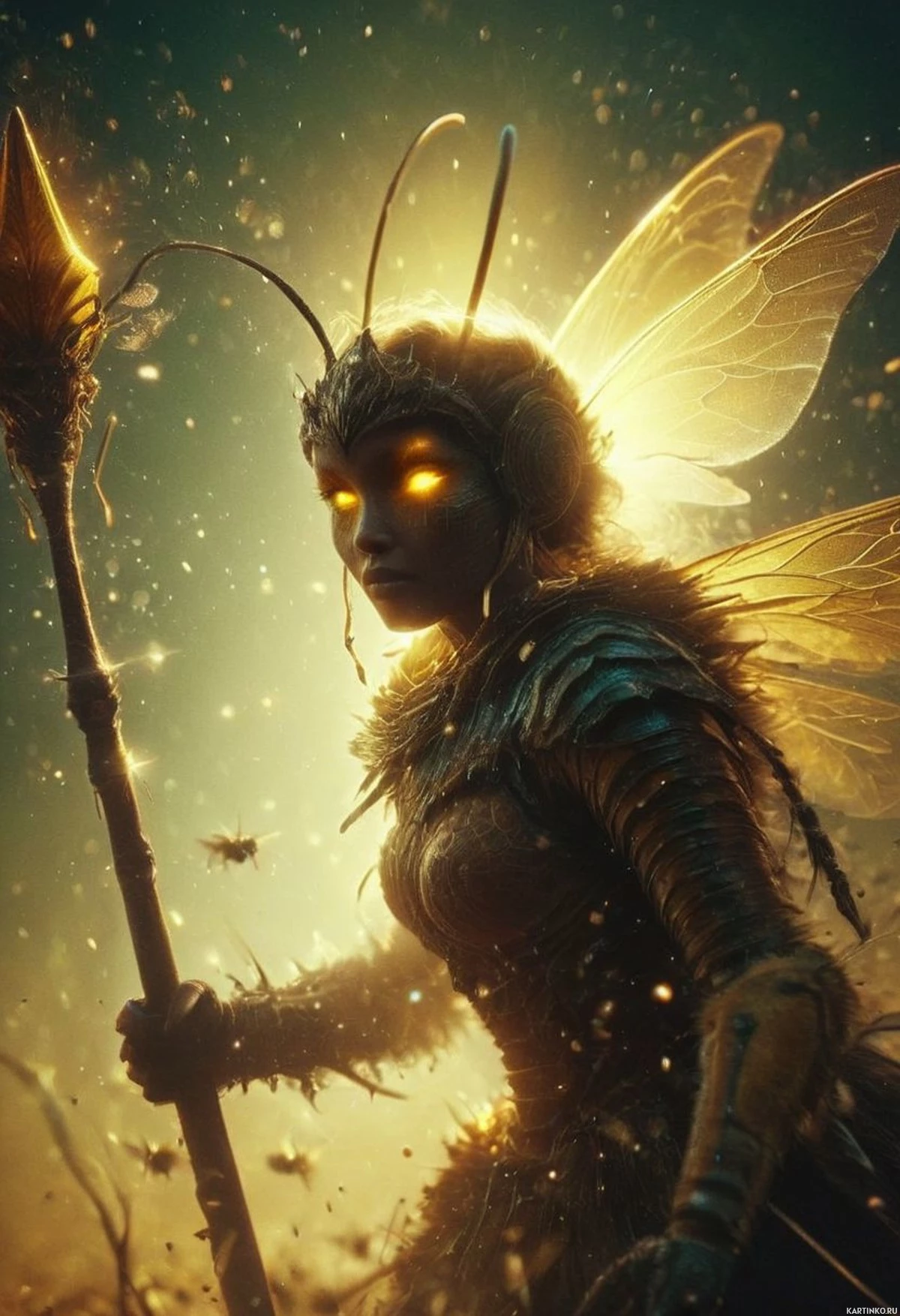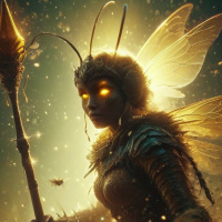 insect wings attached to their back. These wings are spread out as if ready for flight or casting a spell. In the background, there is a dark and ominous atmosphere, possibly indicative of a battlefield or a place where such characters might inhabit. There are also particles that resemble sparks or
