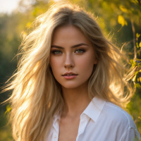 a young woman with long, wavy blonde hair. She has an elegant and poised expression on her face. The woman is wearing what appears to be