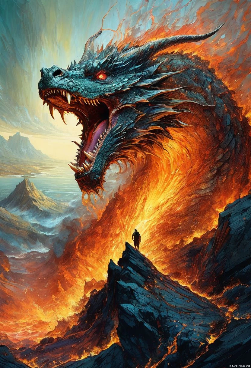 a fantastical scene featuring a dragon. The dragon has