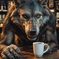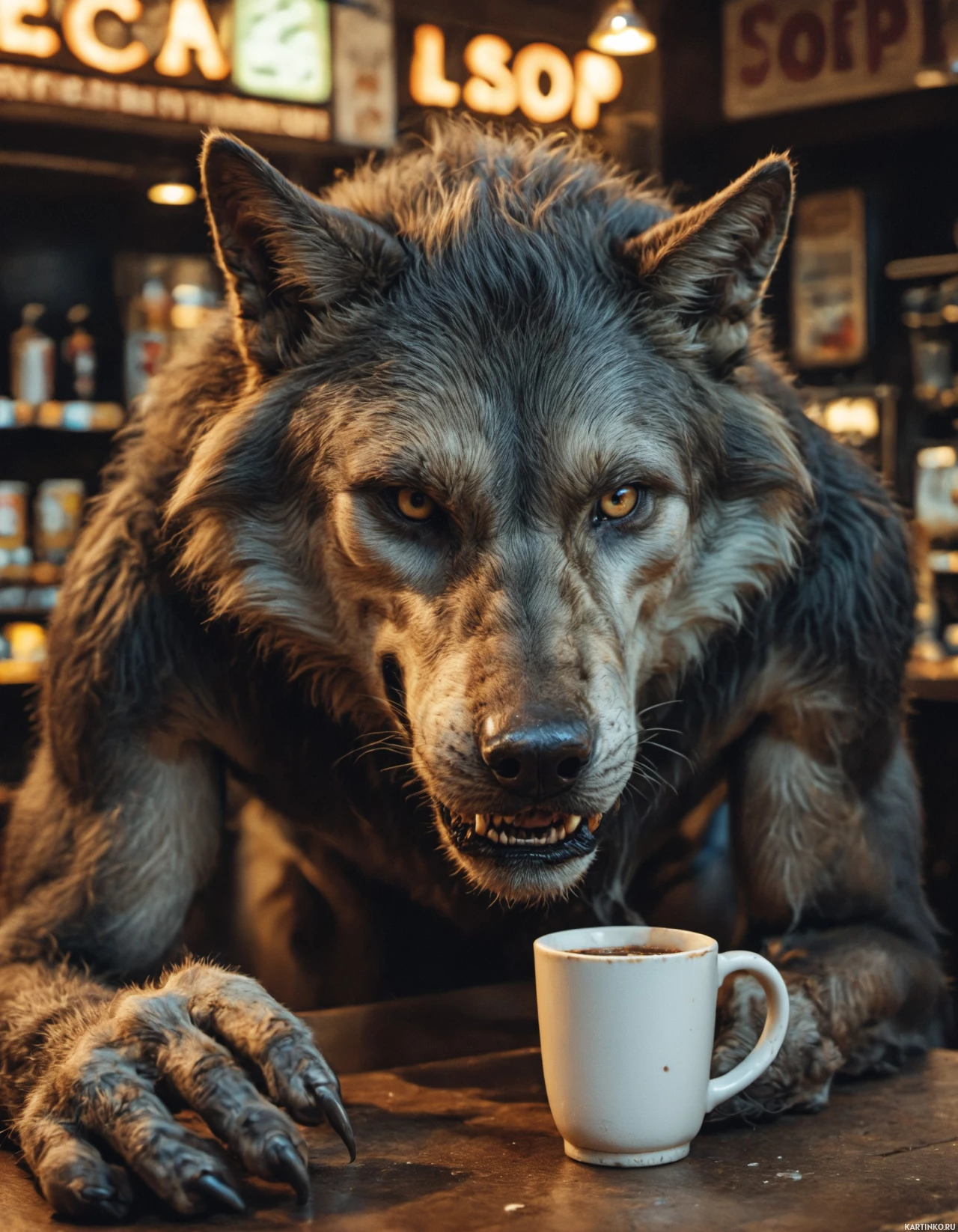 a coffee shop or café counter, with a menu on the wall behind it. On the counter in front of the werewolf are two cups of coffee, one closer to the viewer and the other slightly further away. The werewolf has